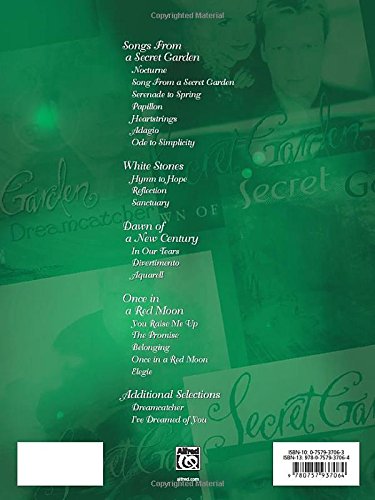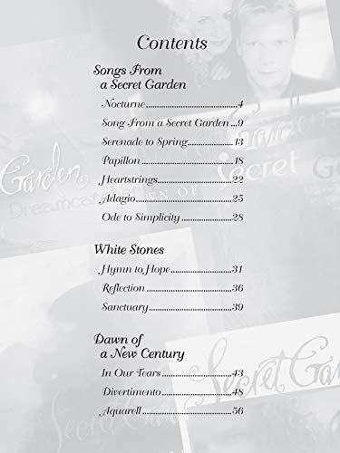 Selected works from Secret Garden’s five best-selling albums. Titles are: Nocturne * Song from a Secret Garden * Serenade to Spring * Papillion * Heartstrings * Adagio * Ode to Simplicity * Hymn to Hope * Reflection * Sanctuary * In Our Tears * Divertimento * Aquarell * You Raise Me Up * The Promise * Belonging * Once in a Red Moon * Elegie * Dreamcatcher * I’ve Dreamed of You.