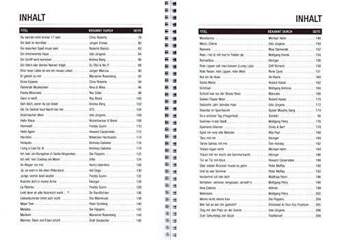 1000 en 1 nacht – Klaus Lage· 7 vaten wijn – Roland Kaiser · 99 ballonnen – Nena· Maar gelieve met room – Udo Jürgens· Maar je hebt alleen maar één keer voor mij – Nilsen Brothers· Afscheid is een scherp zwaard – Roger Whittaker· Ager dios Amor – Andy Borg· Albany – Roger Whittaker · Alles wat ik wil – Höhner· Aloha Oe – Freddy Quinn· Amoi seg’ ma uns weer – Andreas Gabalier· Amsterdam – Axel Fischer feat. Cora · Anita – Costa Cordalis· Anneliese – Peter Alexander· Anuschka – Udo Jürgens· Ademloos door de nacht – Helene Fischer· Bee Maja – Karel Gott· Brons, Zilver en Goud – Wolfgang Petry· Bruto Sociaal product – Gier Vlucht · Bungalow in Santa ergens – De Flippers· Butterfly – Daniel Gerard· Bye My Love – Black Fööss· Capri-Fischer – De Flippers· Cowboy en Indianen – Olaf Henning· Da sprach der oude Häuptling van de Indianen – Gus Backus· Het lied van de Smurfen – Vader Abraham· Het mooie meisje van zijde één Howard Carpendale· Jouw sporen in het zand – Howard Carpendale· De jongen met de mondharmonica – Bernd Clüver· De oude ridderliet – Hot Dogs· De visser van St. Juan – Andy Borg · De gitaar en de zee – Freddy Quinn· De handen naar de hemel – De kolibris· De Karawane trekt verder – Howane hner· De Kleine kroeg, Peter Alexander, de rode zon van Barbados, de flippers, je hebt mij duizend keer belogen, Andrea Berg. Je kunt niet altijd 17 zijn – Chris Roberts· Een bed in korenveld – Jürgen Drews· Ein Bißcu.v.m…