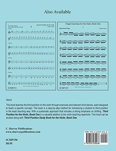 Introducing Third Position for the Violin!This book teaches the third position on the violin through exercises and relevant short pieces, each designed to teach a specific concept. Third Position for the Violin, Book One is a step-by-step method for introducing the position to you in the least daunting way!Each skill is taught with one or more exercises, followed by a short piece that uses the skill that was just taught. This teaches the student how to use skills in the most practical way, in so that they will be able to easily play third position when it is encountered in standard violin repertoire, such as the Vivaldi Violin Concerto in A Minor. With a systematic approach that includes a strong emphasis on shifting, Third Position for the Violin, Book One is a valuable addition to the violin teaching repertoire. This book can be accompanied by Third Position Study Book for the Violin, Book One, which focuses on playing across strings and reading notes in third position.