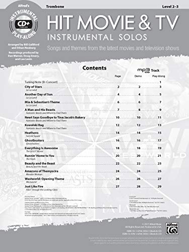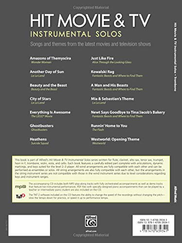 This series offers a versatile selection of hit movie and TV music for flute, clarinet, alto sax, tenor sax, trumpet, horn in F, trombone, violin, viola, and cello. Each book contains carefully edited arrangements appropriate to each instrument, and well suited for level 2–3 students. The CD includes a fully orchestrated demo track of each song, which features a live instrumental solo performance, followed by a play-along track. Also included are PDFs of piano accompaniments, and Alfred’s Tempo Changer Software. Titles: Amazons of Themyscira (Wonder Woman) * Another Day of Sun (La La Land) * Beauty and the Beast (Beauty and the Beast) * City of Stars (La La Land) * Everything Is Awesome (The Lego Batman Movie) * Ghostbusters (Ghostbusters) * Heathens (Suicide Squad) * Just Like Fire (Alice Through the Looking Glass) * Kowalski Rag (Fantastic Beasts and Where to Find Them) * A Man and His Beasts (Fantastic Beasts and Where to Find Them) * Mia & Sebastian’s Theme (La La Land) * Newt Says Goodbye to Tina / Jacob’s Bakery (Fantastic Beasts and Where to Find Them) * Runnin’ Home to You (The Flash) * Westworld: Opening Theme (Westworld).